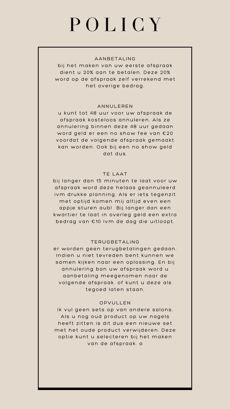 Lees voor het maken van uw afspraak goed de huisregels door op mijn instagram pagina. Zodat alles duidelijk is. Bedankt alvast voor het maken van uw afspraak!